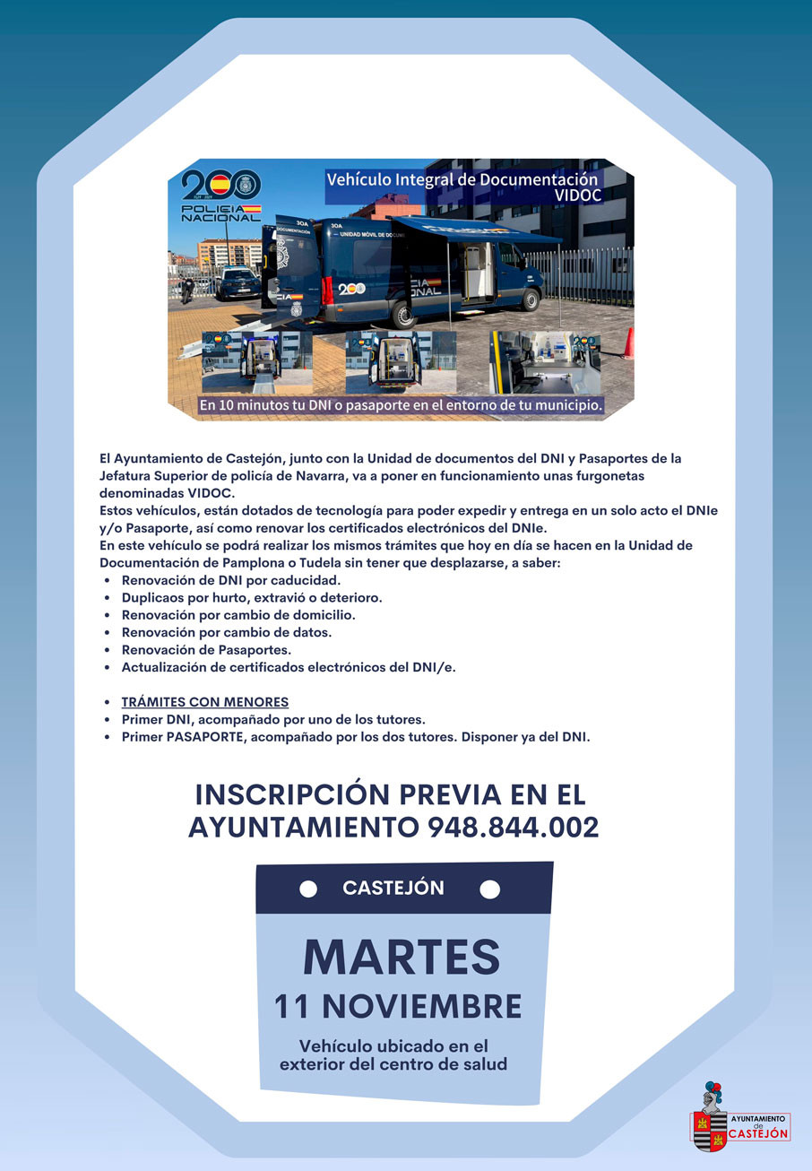 En 10 minutos tu DNI o Pasaporte. Martes 11 de noviembre en Castejón. Inscripción previa en el Ayuntamiento Tel. 948 844 002 Más información en cartel adjunto.