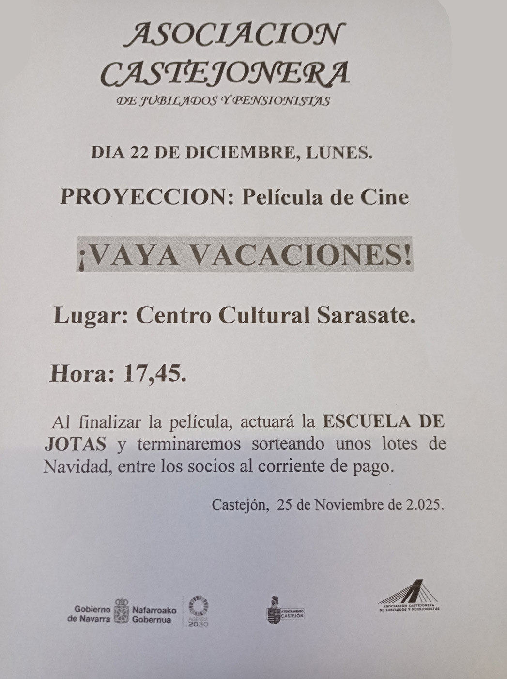 ¡Vaya vacaciones! Al finalizar, actuación de la Escuela de jotas y sorteos de lotes de Navidad. Más información en cartel adjunto.