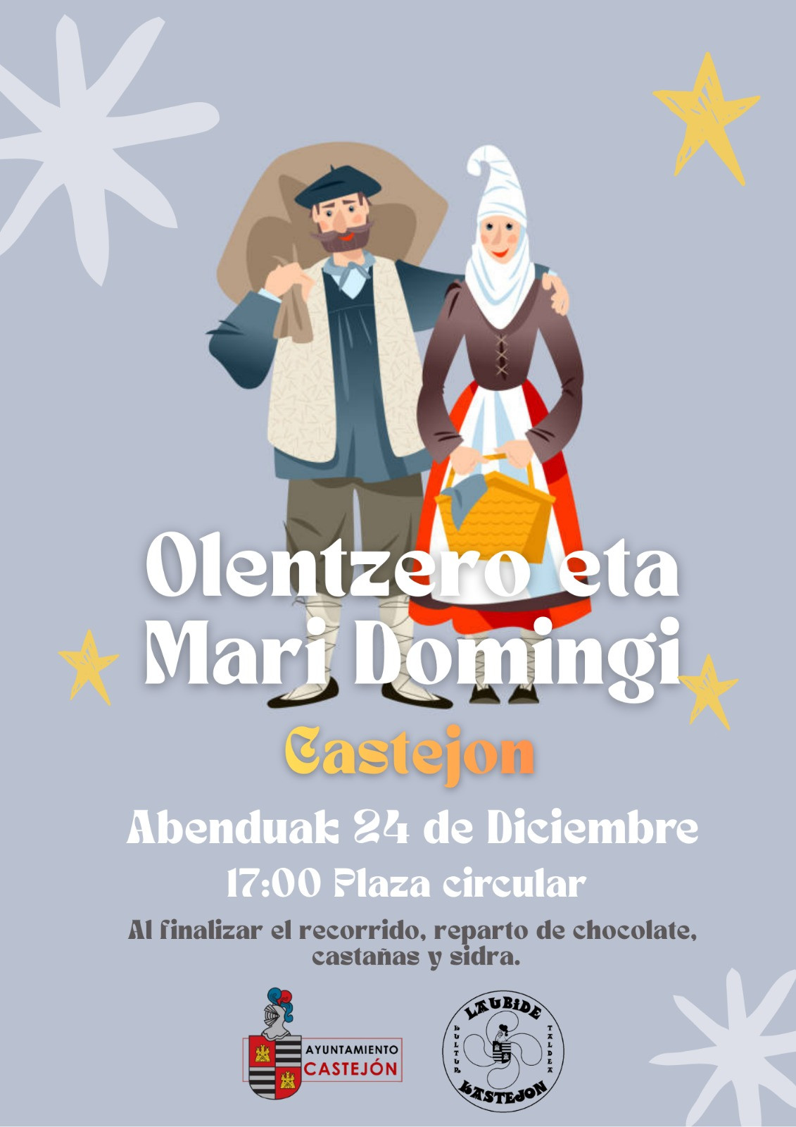 El Olentzero y Mari Domingi realizarán el recorrido habitual para llegar a la plaza de los Fueros, donde recibirá a los niños y niñas de la localidad y se repartirán castañas y chocolate. Plaza Constitución / Calles Castejón