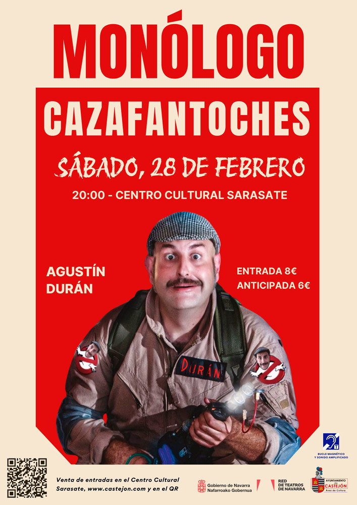 Agustín Durán presenta 'Cazafantoches'. Entrada: 8€ / Anticipada: 6€. Venta de entradas en el Centro Cultural Sarasate, www.castejon.com y en el QR.