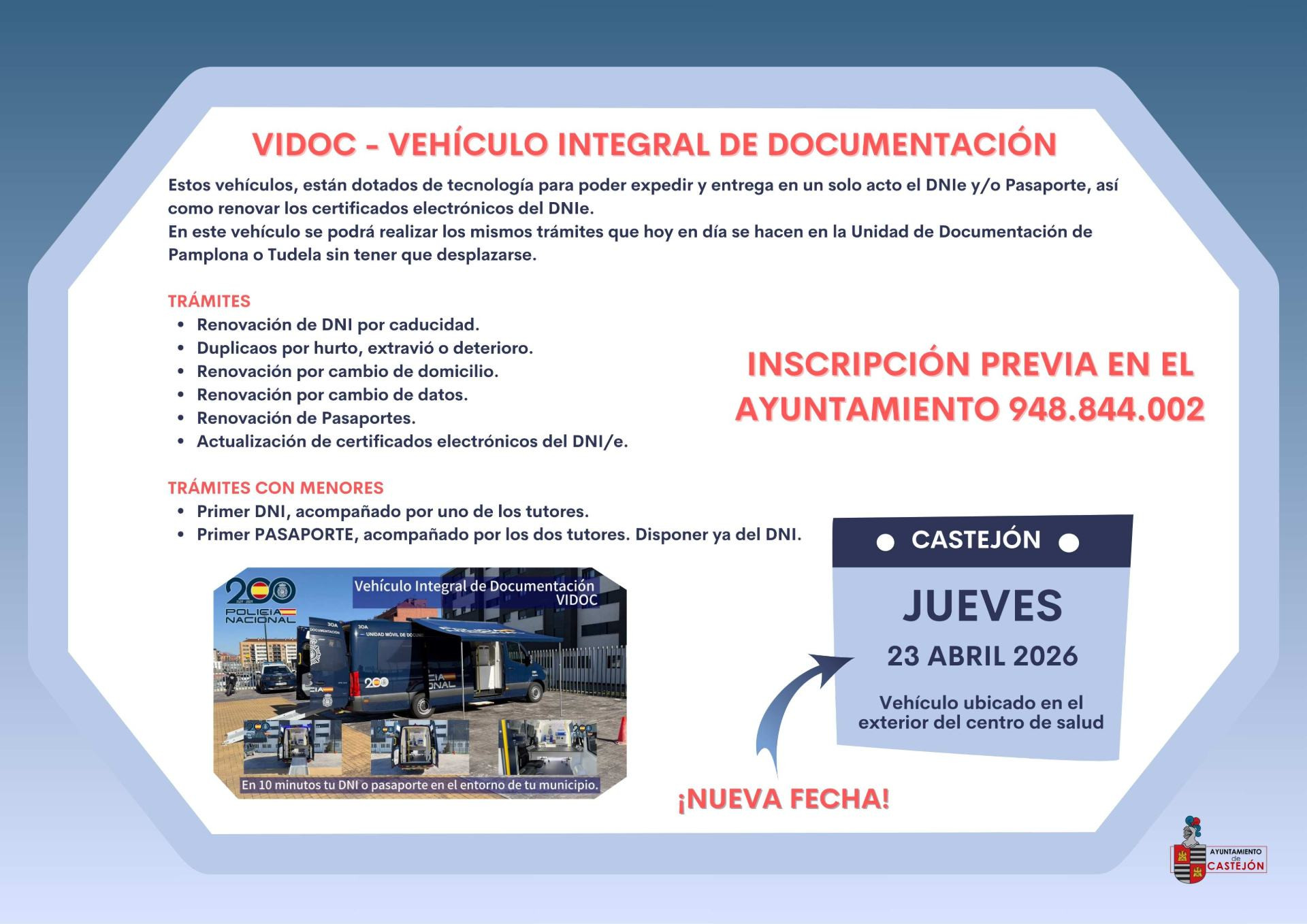 23 de abril Exterior del centro de salud, Castejón. Inscripción previa en el Ayuntamiento. Tel 948 844 002 Vehículo equipado para la expedición y renovación de DNIe y/o Pasaporte, así como la actualización de certificados electrónicos.